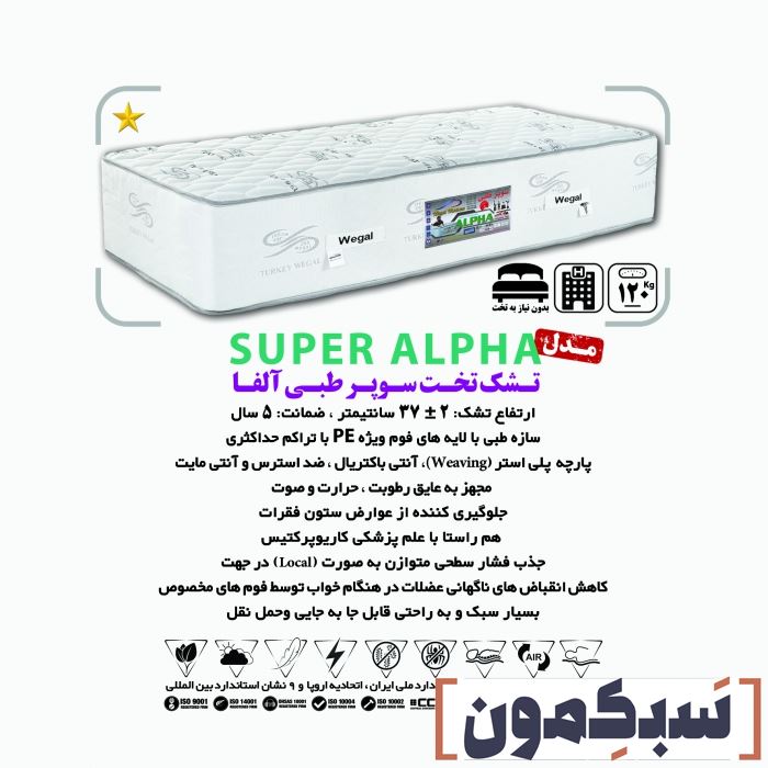 تشک یک نفره وگال مدل سوپر طبی آلفا سایز 200x120 سانتی متر
