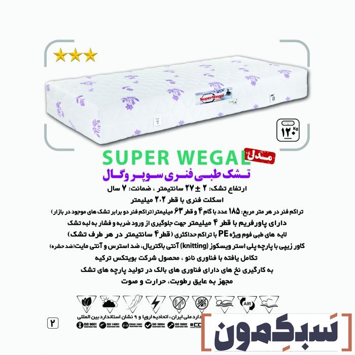 تشک یک نفره وگال مدل سوپر سایز 200x120 سانتی متر